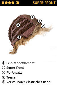 Bei dieser Tressenperücke ist der Bereich des Scheitels mit Monofilament – einer sehr dünnen Gaze (sehr dünnes Gewebe) – versehen. Auf diesem Monofilament ist jedes Haar in feiner Handarbeit einzeln eingeknüpft. Das Monofilament sieht aufgrund seiner Transparenz und der feinen Knüpftechnik wie die eigene Kopfhaut aus. So wirkt die Perücke an der stark einsehbaren Stelle des Scheitels besonders natürlich. Der restliche Teil der Perücke ist tressiert. Durch den Monofilament- Scheitel liegt die Frisur am Oberkopf flach an – ebenfalls ein wichtiges Merkmal für ein natürliches Aussehen. Außerdem ist die tressierte Montur mit einem Filmansatz im Stirnbereich (SUPER-FRONT) kombiniert. Dieser ermöglicht stirnfreie Frisuren.
